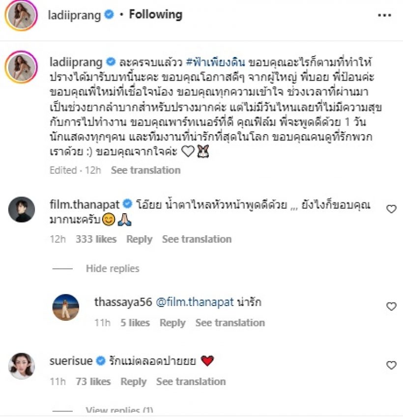 ล่าสุด เลดี้ปราง โพสต์ภาพเกี่ยวกับละครที่เล่นประกบคู่กับ ฟิล์ม ธนภัทร เรื่องฟ้าเพียงดิน ที่เดินทางมาถึงตอนสุดท้ายโดยมีข้อความว่า “ละครจบแล้วว #ฟ้าเพียงดิน ขอบคุณอะไรก็ตามที่ทำให้ปรางได้มารับบทนี้นะคะ ขอบคุณโอกาสดี ๆ จากผู้ใหญ่ พี่บอย พี่ป้อนค่ะ ขอบคุณพี่ใหม่ที่เชื่อใจน้อง ขอบคุณทุกความเข้าใจ ช่วงเวลาที่ผ่านมาเป็นช่วงยากลำบากสำหรับปรางมากค่ะ แต่ไม่มีวันไหนเลยที่ไม่มีความสุขกับการไปทำงาน ขอบคุณพาร์ทเนอร์ที่ดี คุณฟิล์ม พี่จะพูดดีด้วย 1 วัน นักแสดงทุก ๆ คน และทีมงานที่น่ารักที่สุดในโลก ขอบคุณคนดูที่รักพวกเราด้วย 🙂 ขอบคุณจากใจค่ะ 🤍🐰”