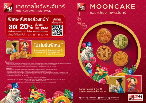 - เปิดพรีออเดอร์ รับส่วนลด 20% เมื่อลูกค้าสั่งจองขนมไหว้พระจันทร์ล่วงหน้า จำนวน 4 ชิ้นขึ้นไป ตั้งแต่วันนี้-31 สิงหาคม 2565 ผ่าน Call Center S&P Delivery โทร.1344