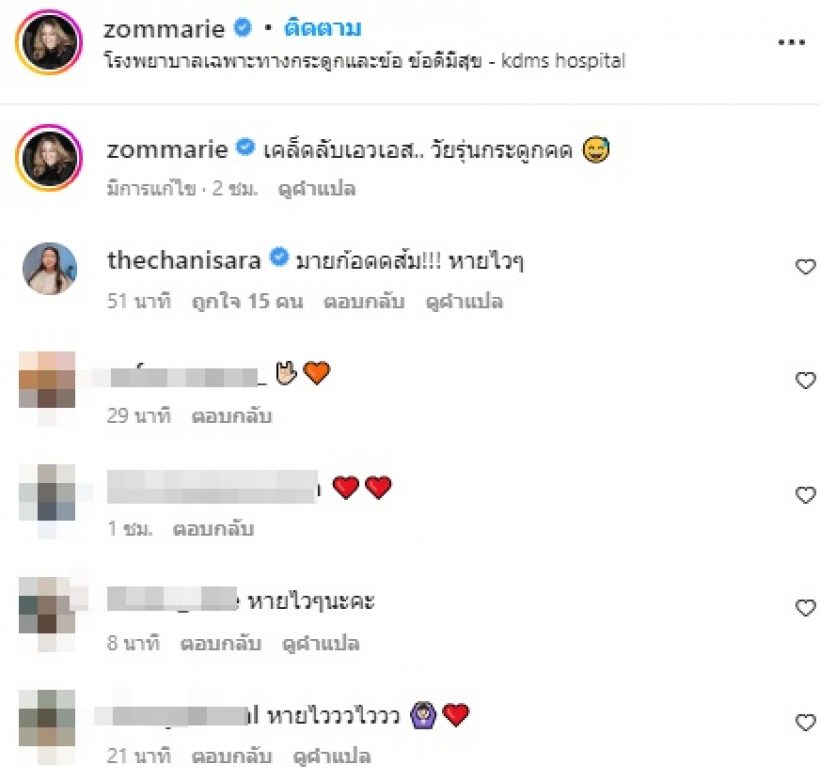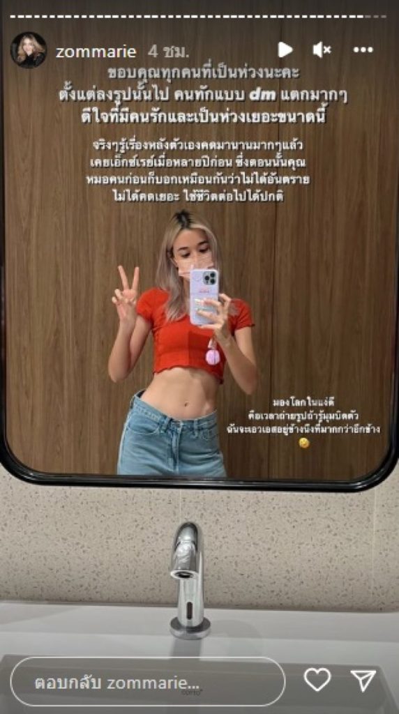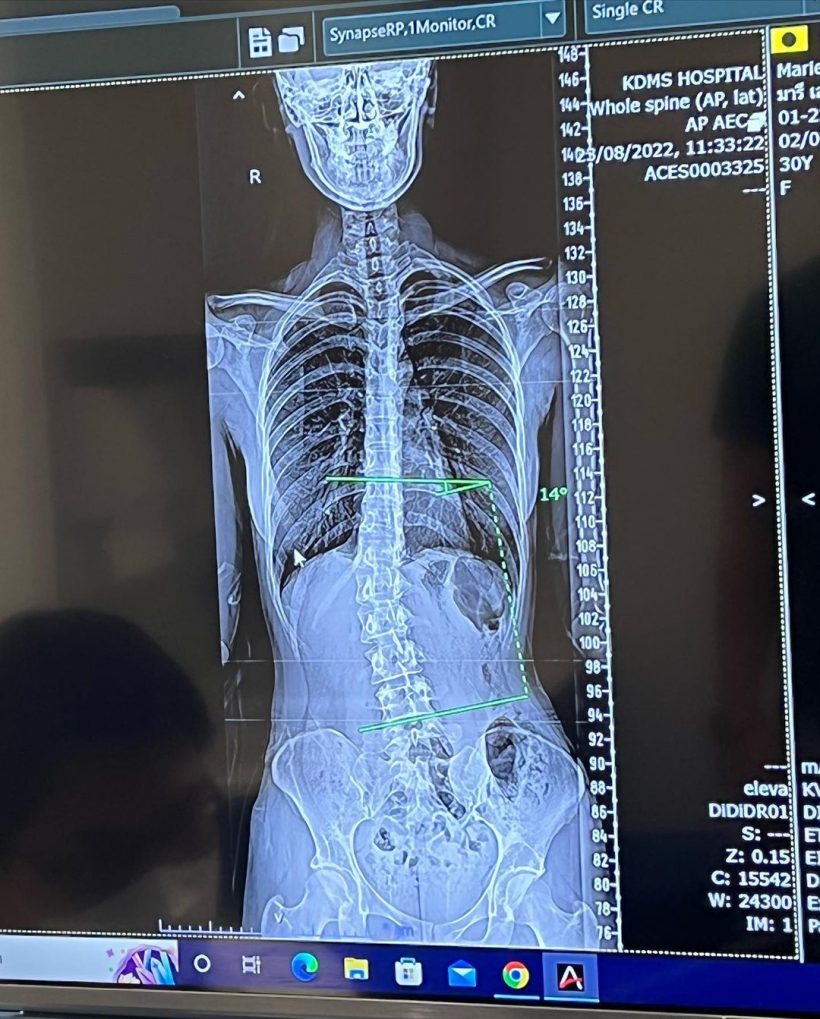 ล่าสุด สาวส้ม โพสต์ภาพเอ็กซเรย์กระดูกพร้อมแคปชั่นว่า “เคล็ดลับเอวเอส.. วัยรุ่นกระดูกคด 😅” นอกจากนี้ก็ได้โพสต์สตอรี่บอกว่า “คุณหมอบอกว่าใช้ชีวิตตามปกติได้เลย ไม่ได้คดมาจนต้องผ่าตัด อายุขนาดนี้ไม่น่าคดเพิ่ม ไม่กระทบการใช้ชีวิตค้าบ ส่วนการให้กลับมาตรง หมอก็พูดตรง ๆ ว่าทำไม่ได้” ทำเอาเหล่าแฟน ๆ เป็นห่วงส่งกำลังใจให้รัว ๆ