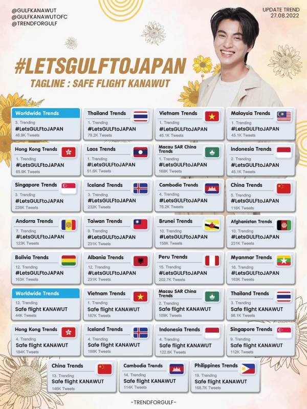 นอกจากกำลังใจที่ทั้งแฟนไทยและอินเตอร์แฟนร่วมส่งให้ทางหนุ่มกลัฟและทีมงานเดินทางไปจัดแฟนมีตติ้งแล้วยังส่งผลให้เทรนด์ #LetsGULFtoJAPAN พุ่งขึ้นอันดับที่ 3 ของ เทรนด์โลก และครองอันดับ 1 ร่วม 6 ประเทศ อาทิ ประเทศไทย เวียดนาม มาเลเซีย ฮ่องกง สปป.ลาว และเขตบริหารพิเศษมาเก๊าแห่งสาธารณรัฐประชาชนจีน เป็นต้น