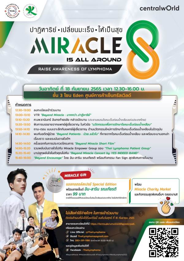 เดือนกันยายนของทุกปี เป็นเดือนที่นานาประเทศทั่วโลก รวมถึงประเทศไทย ร่วมกันรณรงค์เพื่อสร้างความตระหนักต่อ “โรคมะเร็งต่อมน้ำเหลือง” (Lymphoma Awareness Month)” ซึ่งเป็นถือได้ว่าเป็นโรคร้ายแรงอันดับหนึ่งในบรรดาโรคมะเร็งทางระบบโลหิตวิทยา โดยในประเทศไทยมีผู้ป่วยโรคดังกล่าวอยู่สูงถึง 7,000 ราย ด้วยตระหนักถึงความรุนแรงนี้ ชมรมโรคมะเร็งต่อมน้ำเหลืองแห่งประเทศไทย นำโดย ศ.นพ.ธานินทร์ อินทรกำธรชัย จึงได้จัดงานเสวนา “ปาฏิหาริย์-เปลี่ยนมะเร็ง-ให้เป็นสุข: MIRACLE is all around” ครั้งที่ 8 ในหัวข้อ Beyond Miracle เพื่อให้เสริมสร้างความรู้ความเข้าใจที่ถูกต้องเกี่ยวกับอาการของโรค ความก้าวหน้าในการรักษา รวมถึงแนวทางการดูแลตนเองสำหรับผู้ป่วยและผู้ดูแล ในวันอาทิตย์ที่ 18 กันยายน พ.ศ. 2565 เวลา 12.30 – 16.00 น. ณ ลาน Eden ศูนย์การค้าเซ็นทรัลเวิลด์ ชั้น 3