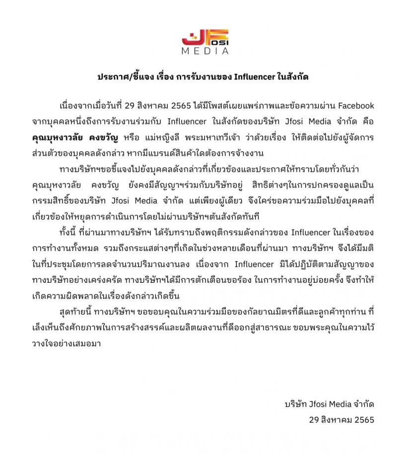 ” เนื่องจากเมื่อวันที่ 29 สิงหาคม 2565 ได้มีโพสต์เผยแพร่ภาพและข้อความผ่าน Facebook จากบุคคลหนึ่ง ถึงการรับงานร่วมกับ Influencer ในสังกัดของบริษัท Jfosi Media จำกัด คือ คุณบุหงาวลัย คงขวัญ หรือ แม่หญิงลี พระมหาเทวีเจ้า ว่าด้วยเรื่องให้ติดต่อไปยังผู้จัดการส่วนตัวของบุคคลดังกล่าว หากมีแบรนด์สินค้าใดต้องการจ้างงาน