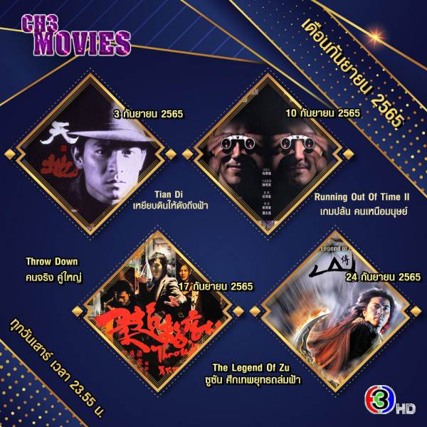 และส่งเข้านอนกับ “แชนแนล ทรี มูฟวี่ส์” ภาพยนตร์ดี ๆ ทุกคืนวันเสาร์ เดือน กันยายน 2565 จะพาไปชมหนังดังทั้งจีนฝรั่งรวมมาไว้หน้าจอ ช่อง 3 ตั้งแต่ เวลา 23.55-01.55 น. เริ่มจาก วันเสาร์ที่ 3 กันยายน256565 มาสนุกกับภาพยนตร์เรื่อง Tian Di: เหยียบดินให้ดังถึงฟ้า นำแสดงโดย : หลิวเต๋อหัว, เฉินเส้าเสีย,หลิวสงเหยิน วันเสาร์ที่ 10 กันยายน2565 ภาพยนตร์เรื่อง Running Out Of Time II: เกมปล้น คนเหนือมนุษย์ นำแสดงโดย: หลิว ชิงเหวิน, เจิ้ง อี้เจี้ยน, หลิน ซีเหลย, รูบี้ หว่อง วันเสาร์ที่ 17 กันยายน2565 ภาพยนตร์เรื่อง Throw Down: คนจริง คู่ใหญ่ นำแสดงโดย : กู่เทียนเล่อ, กัวฟู่เฉิง, เชอร์รี่ ยิง และเสาร์สุดท้าย 24 กันยายน 2565 พบกับ ภาพยนตร์เรื่อง The Legend Of Zu: ซูซัน ศึกเทพยุทธถล่มฟ้า นำแสดงโดย : เจิ้งอี้เจี้ยน, จางป๋อจื่อ, กู่เทียนเล่อ, จางซิยี่ ตามลำดับ