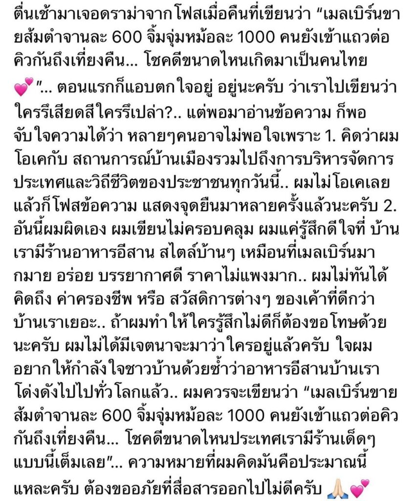 “ตื่นเช้ามาเจอดราม่าจากโพสต์เมื่อคืนที่เขียนว่า “เมลเบิร์นขายส้มตำจานละ 600 จิ้มจุ่มหม้อละ 1,000 คนยังเข้าแถวต่อคิวกันถึงเที่ยงคืน… โชคดีขนาดไหนเกิดมาเป็นคนไทย”