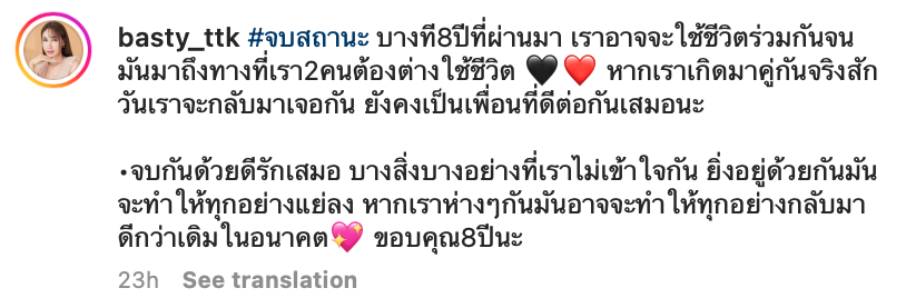 ทำเอาแฟนคลับช็อกแรง เมื่อ ‘บาสตี้-ฐิติกร แจ่มแจ้ง’ เน็ตไอดอลสาวข้ามเพศชื่อดัง ออกมาประกาศเลิกรากับแฟนหนุ่ม ‘ปอนด์ พงศกร’ กลางอินสตราแกรมส่วนตัว @basty_ttk โดยระบุว่า “#จบสถานะ บางที8ปีที่ผ่านมา เราอาจจะใช้ชีวิตร่วมกันจนมันมาถึงทางที่เรา2คนต้องต่างใช้ชีวิต 🖤❤️ หากเราเกิดมาคู่กันจริงสักวันเราจะกลับมาเจอกัน ยังคงเป็นเพื่อนที่ดีต่อกันเสมอนะ