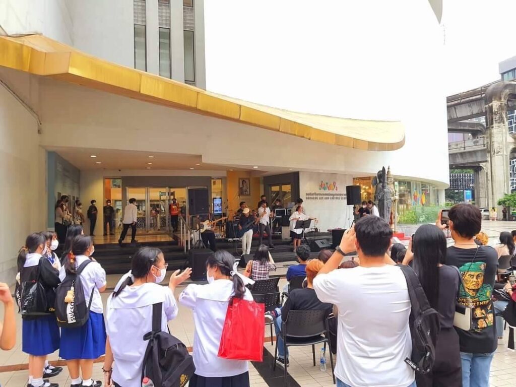 วง MumAyoy โดยนักศึกษาสาขาวิชาดนตรี คณะศิลปกรรมศาสตร์ มหาวิทยาลัยราชภัฏสวนสุนันทา ร่วมกับ กองการสังคีต กรมศิลปากร และสำนักวัฒนธรรม กีฬาและการท่องเที่ยว กรุงเทพมหานคร จัดแสดงดนตรี Street Music (สตรีทโชว์) ณ ลานหน้าหอศิลปวัฒนธรรมแห่งกรุงเทพมหานคร (ปทุมวัน)