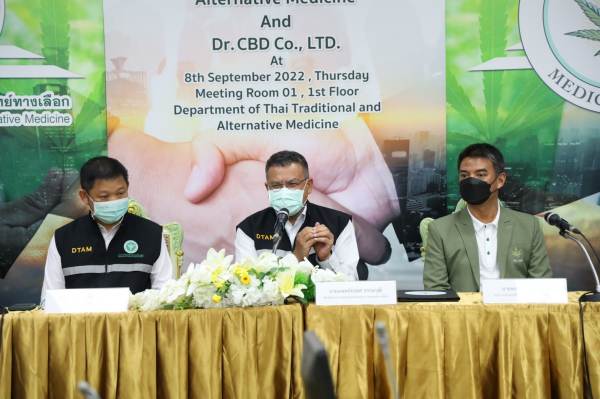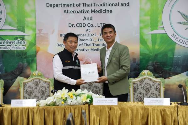 วันที่ 8 กันยายน 2565 นายพรชัย ปัทมินทร ประธานเจ้าหน้าที่บริหาร ดร.ซีบีดี จำกัด ธุรกิจด้าน Health Care ผู้ให้บริการครบวงจรทางด้านกัญชา กัญชง และกระท่อมระดับมาตรฐานทางการแพทย์ เข้าพบนายยงยศ ธรรมวุฒิ อธิบดีกรมการแพทย์แผนไทยและการแพทย์ทางเลือก เพื่อบันทึกข้อตกลงความร่วมมือ ส่งเสริม สนับสนุนการผลิตศึกษา วิจัย การแปรรูป การสกัด การตรวจวิเคราะห์ การพัฒนาผลิตภัณฑ์ การพัฒนายาจากสมุนไพร รวมทั้งกัญชา กัญชง กระท่อม เพื่อใช้ประโยชน์ทางการแพทย์ ทางวิทยาศาสตร์ และทางอุตสาหกรรม ซึ่งร่วมลงนามเป็นพยาน ณ กรมการแพทย์แผนไทยและการแพทย์ทางเลือก