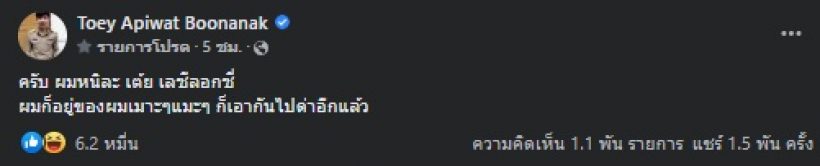 ทำเอา ครูเต้ย โพสต์ Facebook ว่า “ครับ ผมหนิละ เต้ย เลซีลอกซี่ ผมก็อยู่ของผมเมาะ ๆ แมะ ๆ ก็เอากันไปด่าอีกแล้ว” และบอกว่า “ไม่ได้โมโหนะครับ แค่โพสต์ขำ ๆ ครับ ขอบคุณที่เป็นห่วงครับ”