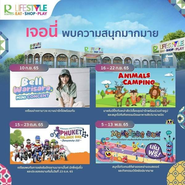 - สนุกกับหลากหลายกิจกรรมเอาใจทุกคนในครอบครัว (วันที่ 10 ก.ย. 65) ฟินกับมินิคอนเสิร์ตจาก เบล วริศรา เจ้าของเพลงฮิต เอาปากกามาวง (วันที่ 16 – 22 ก.ย. 65) เพลิดเพลินไปกับAnimal Camping กับเหล่าสัตว์เลี้ยงสุดน่ารักนานาชนิด (วันที่ 15 – 23 ต.ค. 65) มันส์ไปกับRobinson Lifestyle Thalang Phuket Balance Bike Championship 2022 การแข่งขันจักรยานบาลานซ์ไบค์ กับนักซิ่งรุ่นจิ๋ว พร้อมชมโชว์จักรยานผาดโผนสุดเร้าใจ จากโค้ชบอย-กรณ์ สังฆบุญ นักกีฬาทีมชาติไทย และ (วันที่ 5 – 13 พ.ย. 65) สนุกไปกับการแข่งขันกับเหล่ามอนสเตอร์ Monster Run พร้อมทั้งกิจกรรมเวิร์คช้อปสนุก ๆ อีกมากมาย