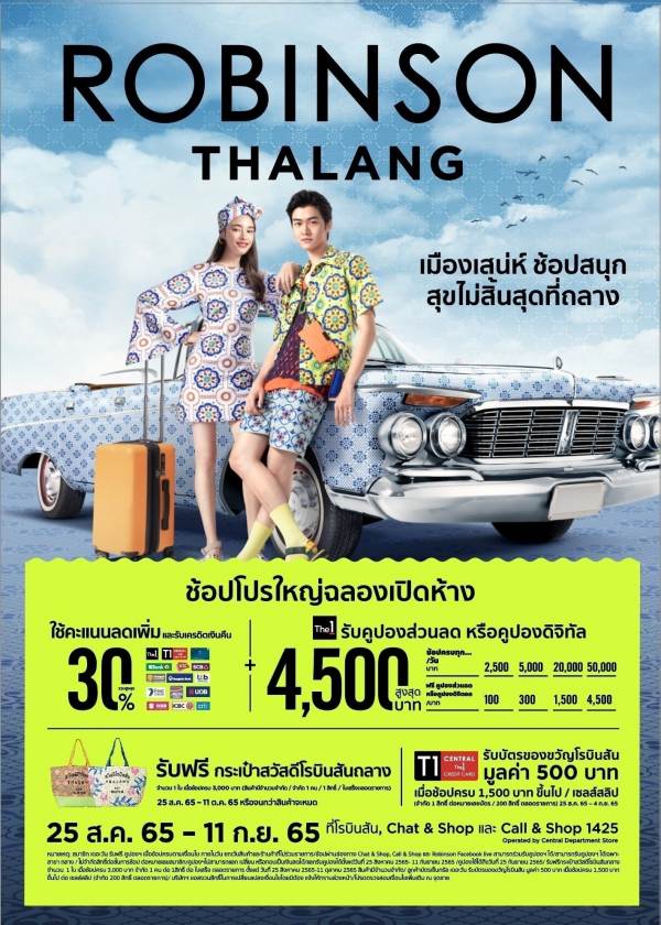 - พบกับโปรโมชั่นสุดว้าว!(วันที่ 25 ส.ค.65 – 11 ก.ย. 65) สมาชิก The1 (เดอะวัน) รับคูปองส่วนลด รวมสูงสุด 4,500 บาท เมื่อช้อปตามเงื่อนไขพิเศษ! วันที่ 25 ส.ค. – 4 ก.ย. 65 รับเพิ่มบัตรของขวัญโรบินสันมูลค่า 500 บาท เมื่อชำระผ่าน Central The1 Credit Card (บัตรเครดิตเซ็นทรัล เดอะวัน) ครบ 1,500 บาทขึ้นไป (จำกัด 200 สิทธิ์ ตลอดรายการ) (วันที่ 25 ส.ค. 65 – 11 ต.ค. 65) รับฟรี! กระเป๋าสวัสดีโรบินสันถลาง จำนวน 1 ใบ เมื่อช้อปครบ 3,000 บาท(จำกัด 1 คน/ 1 สิทธิ์/ใบเสร็จ ตลอดรายการ หรือจนกว่าสินค้าจะหมด) (วันที่ 25 ส.ค. 65 – 31 ต.ค. 65) รับคะแนน The 1 (เดอะวัน) สูงสุด 3 เท่า เมื่อ ช้อป 1,500 บาทขึ้นไป ต่อใบเสร็จ