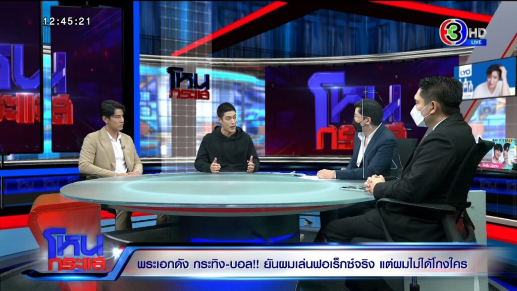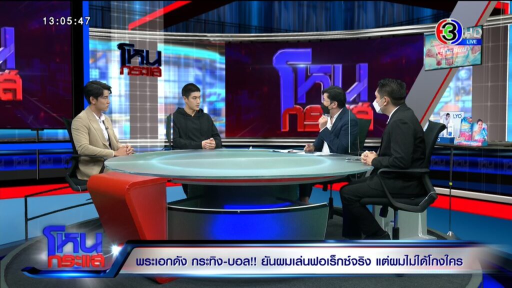 ธนกฤต : วันนี้ที่มาก็ไม่ใช่เพราะรู้จักคุณหนุ่ม แล้วน้องเป็นเด็กช่อง 3 การที่เราส่งชื่อไป เขาก็ตรวจสอบของเขา เป็นอิสระในการทำงานทุกฝ่าย ผลสรุปถ้าน้องไม่ผิด น้องก็ไม่ผิด ถ้าผิดก็รับผิดชอบในสิ่งที่เกิดขึ้น แต่จุดตั้งต้นกระบวนการแชร์ทั้งหลายคือมีคนร้องทุกข์กล่าวโทษ ถ้าไม่มีคนเสียหาย มาร้องทุกข์กล่าวโทษ สิ่งที่เกิดขึ้น ว่าน้องกระทิงหรือบอลไปทำให้ใครเกิดความเสียหาย ถ้าไม่ได้เป็นข้อเท็จจริงอย่างนี้ พอไปปรากฏในโลกโซเชียล ก็กลายเป็นว่าน้องเสียหายเหมือนกัน