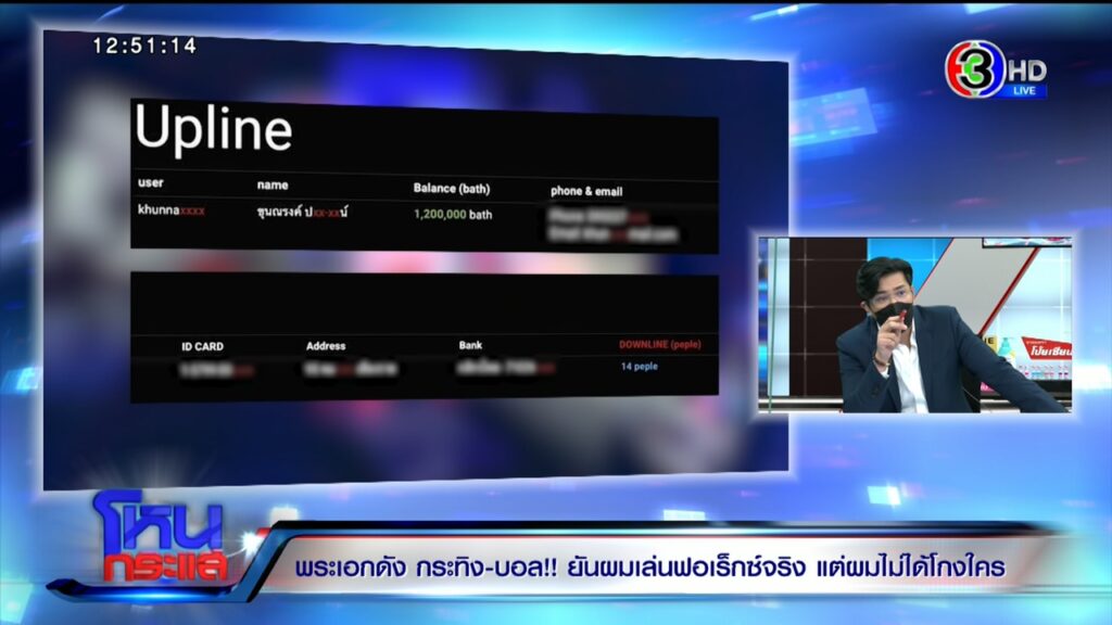 ธนกฤต : จะได้เคลียร์ทุกฝ่าย ถ้าน้องไม่ได้ทำก็อาจเป็นผู้เสียหายก็ได้ แต่ถ้าน้องเกี่ยวข้องก็ถูกดำเนินคดี ก็เข้าสู่กระบวนการไป ไม่เป็นไร เราก็ต้องตรวจสอบ การแนะนำ กับคำชักชวน เชิญชวน จะตามมาด้วยผลประโยชน์ว่ามีด้วยหรือเปล่า ก็กลับไปที่เริ่มต้นว่าเราก็ต้องดูเส้นทางการเงิน น้องได้เงินขนาดไหน ได้เงินตามระบบ หรือมากกว่าระบบที่เขามี เครือข่ายที่มีเป็นไปได้ขนาดไหน ก็ให้พนักงานสอบสวนเขาดู ไม่น่ามีปัญหาเรื่องการตรวจสอบ