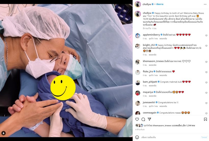 โดย ชลลี่ เผยว่า ถือเป็นของขวัญวันเกิดที่ดีที่สุดของเธอเลยทีเดียว เนื่องจากวันที่ชลลี่คลอดลูกชาย ตรงกับวันเกิดของเธอนั่นเอง “Happy birthday to both of us!! Welcome Baby Brave, aka “Tinn” to this beautiful world. Best Birthday gift ever 🎁 16/09 ต้อนรับน้องเบรฟ หรือ เด็กชาย ติณห์ สู่โลกที่สวยงาม | ลูกเป็นของขวัญวันเกิดของแม่ที่ดีที่สุด จากนี้แม่จะมีหนูเป็นเพื่อนฉลองวันเกิดทุกปีเลยนะ 💞”