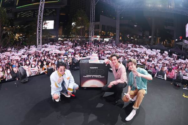 ฉลองเดบิวต์ครบรอบ 3 ปี ไปเมื่อวันก่อน สำหรับสามหนุ่ม TRINITY (ทรินิตี้) “เติร์ด-ลภัส, ปอร์เช่-ศิวกร, แจ๊คกี้-จักริน” ศิลปินในสังกัด 4NOLOGUE (โฟร์โนล็อค) ชวนเหล่า TWILIGHT (ทไวไลท์ : ชื่อแฟนคลับ) มาใช้เวลาดี ๆ ร่วมกันตั้งแต่เที่ยงวันยันพระอาทิตย์ตก ในงาน “TRINITY Sweet Sundown” งานครบรอบ 3 ปี TRINITY & TWILIGHT ทั้งทีจะธรรมดาได้ไง แฟน ๆ จำนวนมหาศาลทั้งในกรุงเทพฯ และต่างจังหวัดเดินทางมาด้วยใจ พร้อมอุปกรณ์เชียร์ครบมือ รวมพลเข้ายึดสยามสแควร์ทำเอาพื้นที่จัดงานเต็มจนล้นไปด้วยกองทัพ TWILIGHT ของ TRINITY แม้งานจะเริ่มตอนเที่ยงวัน แต่บางคนไปรอตั้งแต่เช้า บางคนไปรอตั้งแต่กลางคืนก่อนวันงาน คงต้องบอกว่าสิ่งเหล่านี้เกิดขึ้นจากความรักล้วน ๆ