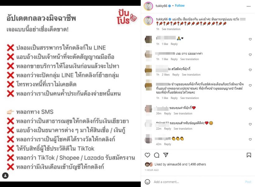 “ตุ๊กกี้ ชิงร้อยชิงล้าน” โพสต์เตือนกลลวงมิจฉาชีพในทุกรูปแบบ
