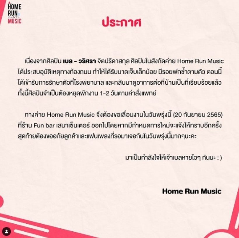 ส่งความห่วงใยให้ “เบล วริศรา” ประสบอุบัติเหตุทางรถ