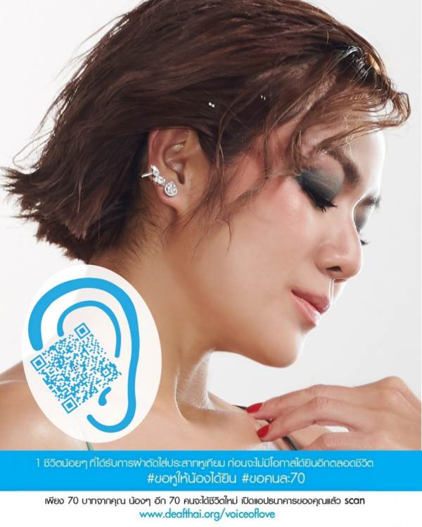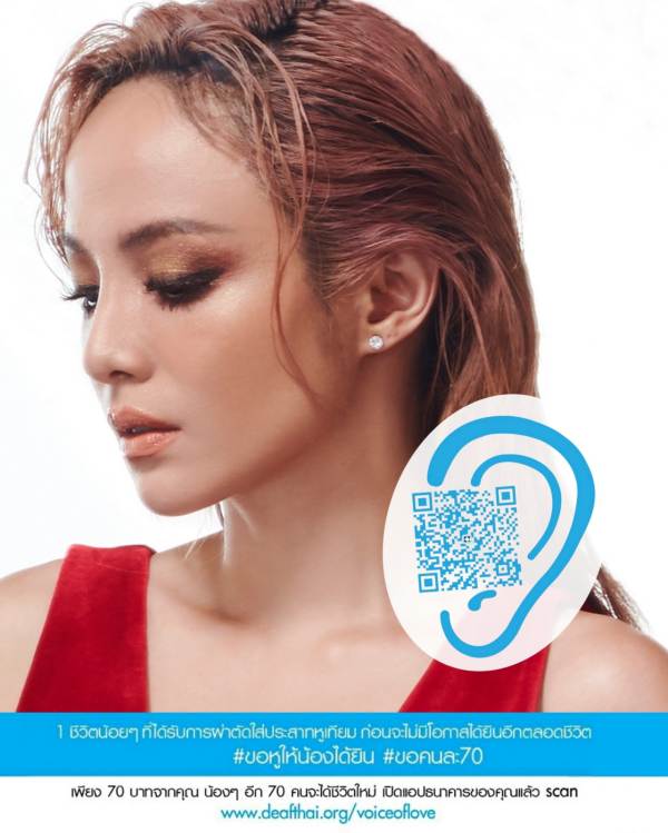 “พวกเราอยากเชิญชวนทุกคนเป็นส่วนหนึ่งในการให้ ร่วมมอบชีวิตใหม่ให้เด็กๆ หูหนวก เพื่อพวกเขาจะได้มีโอกาสดีๆ ในชีวิตอีกมากมายค่ะ เพียงบริจาคคนละ 70 บาท หรือตามกำลัง สมทบทุนผ่าตัดใส่ประสาทหูเทียมให้เด็กหูหนวกสามารถเรียนรู้และใช้ชีวิตได้เหมือนเด็กปกติค่ะ”