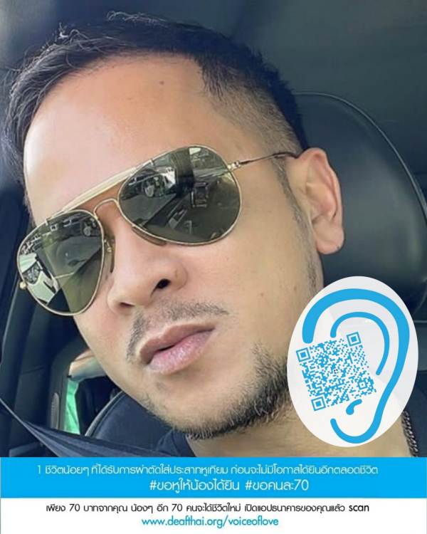 “เพียงคนละ 70 บาท ช่วยให้น้องหูหนวก 70 คนได้มีชีวิตใหม่ สามารถได้ยินเสียงคนที่รักเขา และช่วยให้เด็กทั้ง 70 คน ได้มีอนาคตที่สดใส มาร่วมกันเป็นผู้ให้และผู้สร้างชีวิตใหม่ให้กับน้อง ๆ กันนะครับ”