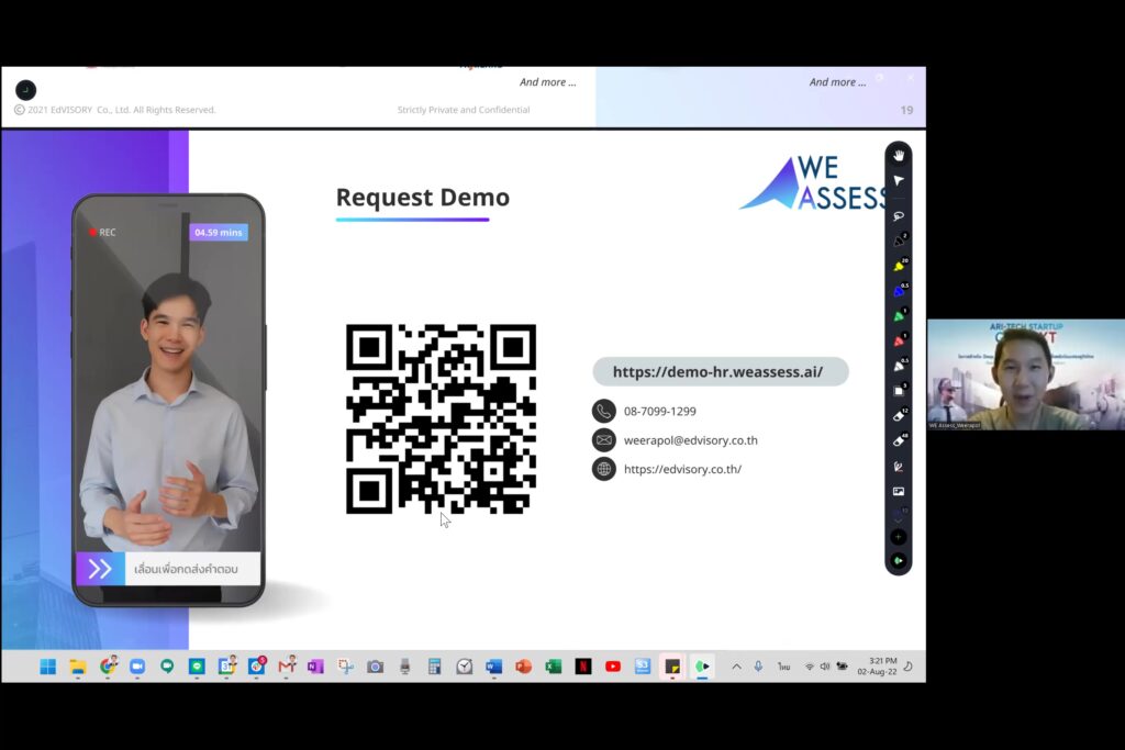 - ด้านการบริหารจัดการธุรกิจ ได้แก่12) LightWork : แพลตฟอร์มที่ผสานเทคโนโลยี Robotic Process Automation และ AI เพื่อสร้างโปรแกรมหุ่นยนต์ผู้ช่วยมาแบ่งเบาภาระการทำงาน เพื่อเพิ่มประสิทธิภาพ และลดเวลาการทำงาน นำไปใช้ได้หลากหลายแผนก และอุตสาหกรรม 13) ManaWork : แพลตฟอร์มเพิ่มประสิทธิภาพ WFH ด้วยเทคโนโลยี AI เพื่อเชื่อมต่อให้ผู้ใช้งานสามารถวิเคราะห์ข้อมูล และเพิ่มประสิทธิภาพในการทำงานอย่างเป็นระบบ 14) Vulcan : สร้างอาชีพให้ผู้พิการทำงานยุคใหม่เป็น ‘AI Trainer’ เพื่อพัฒนาโมเดล AI หรือจัดทำข้อมูลเฉพาะ เป็นอีกหนึ่งทางเลือกให้บริษัทจ้างงานผู้พิการตามกฎหมาย 15) WE Assess : ระบบสัมภาษณ์งานออนไลน์ พร้อม AI ช่วยวิเคราะห์จุดแข็งจุดอ่อนของผู้สมัครงาน ที่ช่วยลดเวลากว่าร้อยละ 50