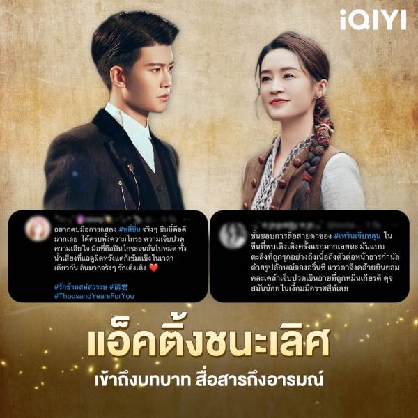 เรียกว่ารีแอ็กชันมาดีตั้งแต่เริ่มสตรีมไปได้ไม่นานกับผลงานซีรีส์รักสุดตราตรึงของซูเปอร์สตาร์หนุ่มมาแรง “เหรินเจียหลุน” และนางเอกสาวเสน่ห์ล้น “หลี่ชิ่น” ในผลงาน “รักข้ามสหัสวรรษ (Thousand Years For You)” หลังจากที่เปิดตัวกวาดคะแนนความนิยมอย่างท่วมท้นถึง 9,000 คะแนนจากผู้ชมทาง iQIYI (อ้ายฉีอี้) รวมทั้งรีวิวเทบวกของผู้ชมทางทวิตเตอร์ที่ทวิตออกมากันไม่ขาดสาย ถ้ากระแสตอบรับปังขนาดนี้ แสดงว่าซีรีส์รักแฟนตาซีเรื่องนี้ไม่ธรรมดาเสียแล้ว iQIYI (อ้ายฉีอี้) เลยขอชวนมาส่อง “เรื่องปังทั้ง 5 ชวนมาฟินกับ รักข้ามสหัสวรรษ (Thousand Years For You)” ไปพร้อมกัน