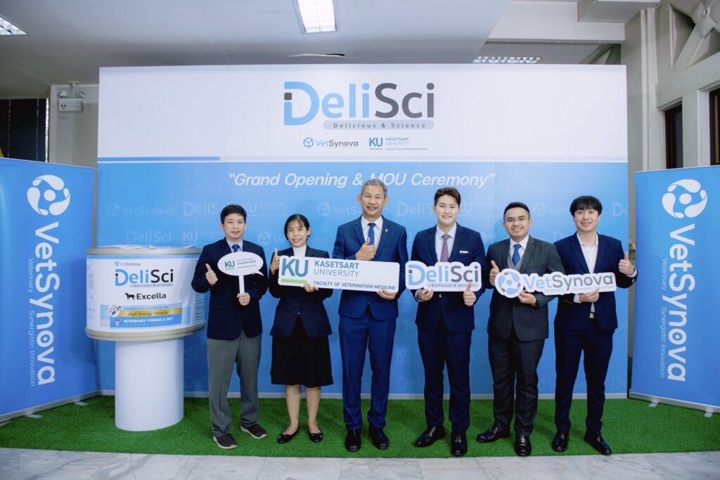 บริษัท เว็ทซินโนว่า จำกัด (VetSynova Co., Ltd.) จับมือกับ คณะสัตวแพทยศาสตร์ มหาวิทยาลัยเกษตรศาสตร์ ลงนามบันทึกข้อตกลงความร่วมมือ (MOU) การวิจัยและพัฒนาผลงานนวัตกรรม และผลิตภัณฑ์อาหารประกอบการรักษาโรค สำหรับสัตว์เลี้ยง แบรนด์เดลิซาย (DeliSci) ที่ย่อมาจาก Delicious and Science ภายใต้แนวคิด “เมื่อความอร่อยและหลักการทางวิทยาศาสตร์ มาบรรจบกันอย่างลงตัว” “When Delicious & Science Meet in Perfect Harmony”