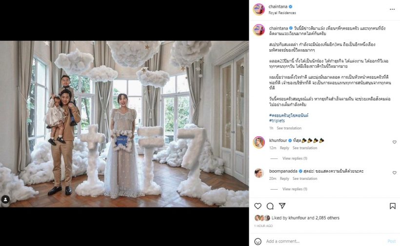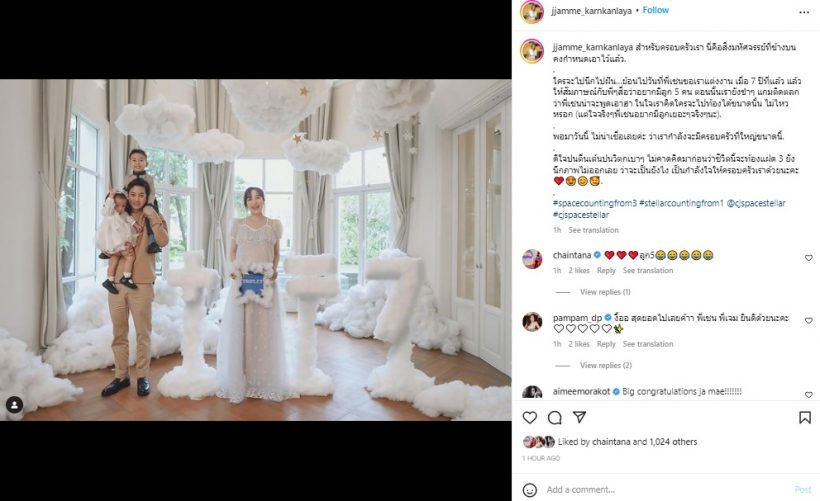 ในขณะที่ สาวเจมส์ โพสต์อินสตราแกรมพร้อมข้อความว่า “สำหรับครอบครัวเรา นี่คือสิ่งมหัศจรรย์ที่ข้างบนคงกำหนดเอาไว้แล้ว ใครจะไปนึกไปฝัน…ย้อนไปวันที่พี่เชนขอเราแต่งงาน เมื่อ 7 ปีที่แล้ว แล้วให้สัมภาษณ์กับพี่ ๆ สื่อว่าอยากมีลูก 5 คน ตอนนั้นเรายังขำ ๆ แกมติดตลกว่าพี่เชนน่าจะพูดเอาฮา ในใจเราคิดใครจะไปท้องได้ขนาดนั้น ไม่ไหวหรอก (แต่ใจจริงๆพี่เชนอยากมีลูกเยอะ ๆ จริง ๆ นะ) พอมาวันนี้ ไม่น่าเชื่อเลยค่ะ ว่าเรากำลังจะมีครอบครัวที่ใหญ่ขนาดนี้ ดีใจปนตื่นเต้นปนวิตกเบา ๆ ไม่คาดคิดมาก่อนว่าชีวิตนี้จะท้องแฝด 3 ยังนึกภาพไม่ออกเลย ว่าจะเป็นยังไง เป็นกำลังใจให้ครอบครัวเราด้วยนะคะ #spacecountingfrom3 #stellarcountingfrom1 @cjspacestellar #cjspacestellar”