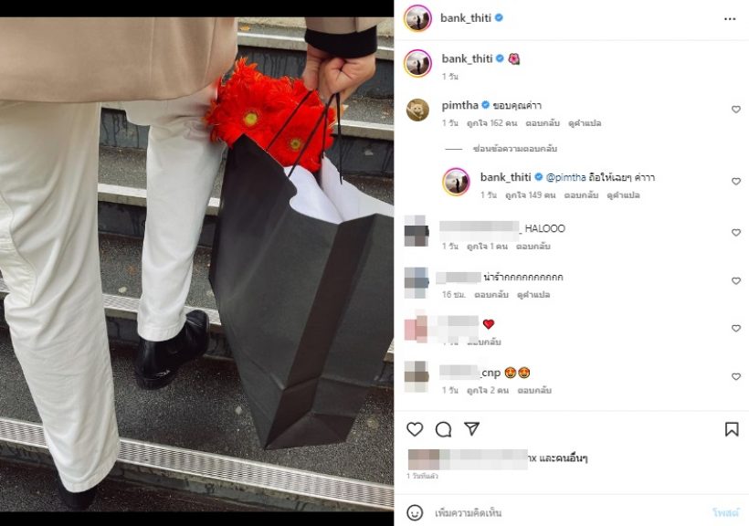 ล่าสุด สาวพิมฐา โพสต์ภาพคู่น่ารัก ๆ พร้อมแคปชั่น ‘Bonjour from the Up side down world 😗 @bank_thiti‘ ในขณะที่ หนุ่มแบงค์ โพสต์ภาพถือของให้ สาวพิมฐา โดย พิมฐา ได้คอมเมนต์ว่า ‘ขอบคุณค่าา’ แบงค์ ตอบกลับว่า ‘ถือให้เฉย ๆ ค่าาา’ งู้ยยยยน่ารักกันไปใหญ่แล้ว อิอิ