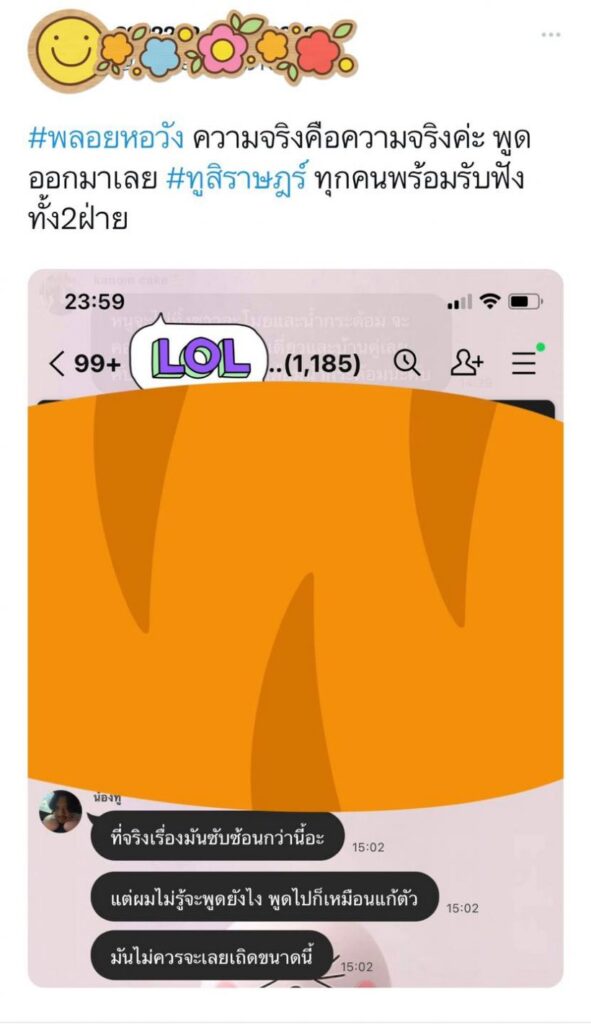 ล่าสุด เพจเฟซบุ๊ก เจ๊มอย 108 ได้เคลื่อนไหวโพสต์ภาพแชทจากหนุ่มทู ที่ระบุว่า “ที่จริงเรื่องมันซับซ้อนกว่านี้อะ แต่ผมไม่รู้จะพูดยังไง พูดไปก็เหมือนแก้ตัว มันไม่ควรจะเถิดขนาดนี้”  งานนี้ก็ต้องจับตารอดูต่อไปค่ะ ว่าหนุ่มทูจะออกมาชี้แจงขยายความเรื่องนี้ยังไง