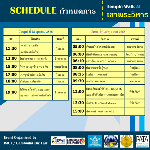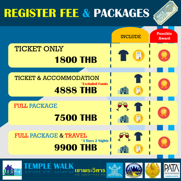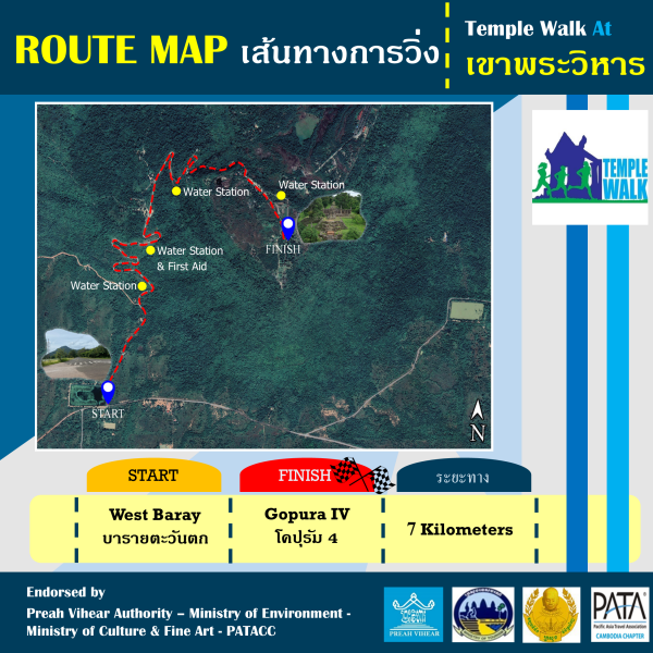 ดร.ธร สินัน ประธาน The Cambodia Tourism Marketing Research and Promotion PATA Cambodia Chapter ประธานการจัดงานกล่าวว่า “วัตถุประสงค์ของการจัดงาน Temple Walk ซึ่งถือเป็นครั้งแรกในประวัติศาสตร์ โดยมีเป้าหมายในการฟื้นฟูเศรษฐกิจในจังหวัดพระวิหารหลังจากที่ผ่านช่วงของการแพร่ระบาดโรคโควิด-19 ด้วยการจัดกิจกรรมนี้ขึ้นมาเพื่อเป็นการเปิดโอกาสให้นักท่องเที่ยวชาวไทยและชาวต่างชาติได้มีโอกาสเดินทางมา ปราสาทพระวิหารซึ่งเป็นมรดกโลกที่สำคัญ เราวางเป้าหมายไว้ว่าจะมีนักวิ่งมาร่วมงานประมาณ 1,500 คน ขณะนี้เรามีห้องพักทั้งจากโรงแรมและเกสต์เฮ้าส์ สามารถรองรับนักท่องเที่ยวได้ถึง 400 ห้องและยังมีโรงแรม รีสอร์ทบริเวณที่อยู่ในพื้นที่ใกล้เคียง หวังเป็นอย่างยิ่งว่างาน Temple Walk No.1/2022 ในปีแรกนี้จะประสบความสำเร็จด้วยดี จึงขอถือโอกาสเชิญชวนพี่น้องชาวไทยเดินทางมาท่องเที่ยวด้วยเพราะในปัจจุบันการคมนาคมสะดวกมีบริษัททัวร์จากทั้งจังหวัดสุรินทร์ ศรีสะเกษ อุบลราชานี นครราชสีมาจัดโปรแกรมการเดินทางให้บริการนักท่องเที่ยวเป็นประจำอยู่แล้ว”