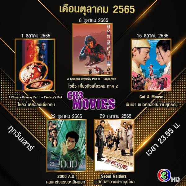 ปิดท้ายกับ “แชนแนล ทรี มูฟวี่ส์” ภาพยนตร์ดี ๆ ทุกคืนวันเสาร์ ตั้งแต่ เวลา 23.55-01.55 น. เริ่มจาก วันเสาร์ที่ 1 ตุลาคม 2565 มาสนุกกับภาพยนตร์เรื่อง A Chinese Odyssey Part I – Pandora’s Box : ไซอิ๋ว เดี๋ยวลิงเดี๋ยวคน นำแสดงโดย : โจวซิงฉือ, จูอิน, เจฟฟรี ลู ต่อด้วย วันเสาร์ที่ 8 ตุลาคม 2565 ภาพยนตร์เรื่อง A Chinese Odyssey Part II – Cinderella : ไซอิ๋ว เดี๋ยวลิงเดี๋ยวคน ภาค 2 นำแสดงโดย: นำแสดงโดย: โจวซิงฉือ, อู๋ม่งต๊ะ, ม่อเหวินเว่ย วันเสาร์ที่ 15 ตุลาคม2565 ภาพยนตร์เรื่อง Cat & Mouse : จั่นเจา แมวหลวงสะท้านยุทธภพ นำแสดงโดย : หลิวเต๋อหัว, จางป่อจือ, ไป่หยูตง, หวงซิวเซิง วันเสาร์ที่ 22 ตุลาคม 2565 ภาพยนตร์เรื่อง 2000 A.D. : คนแกร่งแรงระเบิดนรก นำแสดงโดย : กั๊วฟู่เฉิง, อู๋เอี้ยนจู่ และเสาร์สุดท้าย 29 ตุลาคม2565 พบกับ ภาพยนตร์เรื่อง Seoul Raiders : พยัคฆ์สำอางผ่ากรุงโซล นำแสดงโดย : เหลียงเฉาเหว่ย, ริชชี่ เรน, ซูฉี