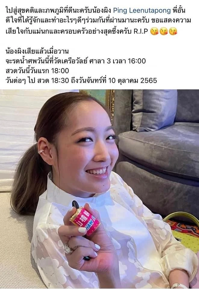 ช็อก! เมื่อไอจีของ aun_pongdej ได้โพสต์ข้อความไว้อาลัย พร้อมแจ้งหมายกำหนดการของการจากไป แท็กถึง @pingilicious ซึ่งเป็นไอจีของ “ผิง พิมพาภรณ์ ลีนุตพงษ์” อดีตนักแสดงสาว โดยมีใจความว่า