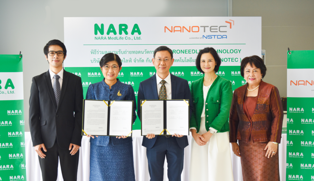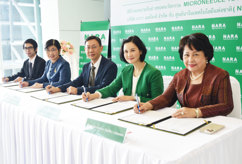 คุณอาวุธ เจริญวัฒนานนท์ CEO บริษัทนารา เมดไลฟ์ จำกัด ได้ร่วมลงนามกับ ดร.วรรณี ฉินศิริกุล ผู้อำนวยการศูนย์นาโนเทคโนโลยีแห่งชาติ ในการพัฒนานวัตกรรม MICRONEEDLE TECHNOLOGY (นวัตกรรมแผ่นแปะเข็มจิ๋ว) โดยมีผู้ช่วยศาสตราจารย์ ดร.จันทร์จิรา วงษ์ขมทอง ร่วมเป็นสักขีพยานในการลงนามครั้งนี้