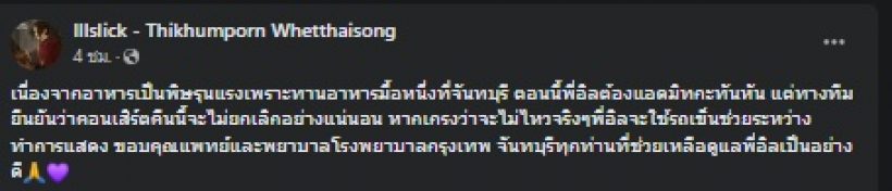 ล่าสุด เพจ Illslick – Thikhumporn Whetthaisong ระบุว่า “เนื่องจากอาหารเป็นพิษรุนแรงเพราะทานอาหารมื้อหนึ่งที่จันทบุรี ตอนนี้พี่อิลต้องแอดมิทกะทันหัน แต่ทางทีมยืนยันว่าคอนเสิร์ตคืนนี้จะไม่ยกเลิกอย่างแน่นอน หากเกรงว่าจะไม่ไหวจริงๆพี่อิลจะใช้รถเข็นช่วยระหว่างทำการแสดง ขอบคุณแพทย์และพยาบาลโรงพยาบาลกรุงเทพ จันทบุรีทุกท่านที่ช่วยเหลือดูแลพี่อิลเป็นอย่างดี”