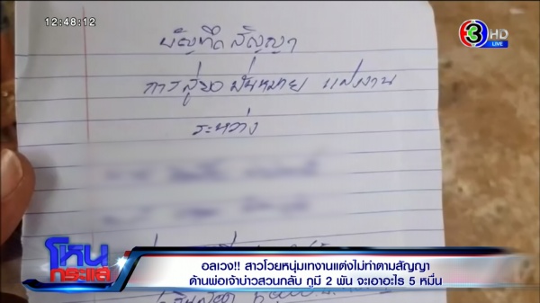 จากกรณีสาวรายหนึ่ง อยู่ จ.อุดรธานี ได้ร้องสื่อมวลชนว่า ถูกชายหนุ่มและครอบครัวฝ่ายชายเทงานแต่ง มีการทำหนังสือสัญญากำหนดการสู่ขอเรียกสินสอด 50,000 บาท ทองคำหนัก 1 บาท ขณะที่พ่อฝ่ายชายเอาเงินวางไว้แค่ 2 พันบาท ทำให้ตกลงกันไม่ได้ รู้สึกเสียใจและเสียหน้า ด้านเจ้าบ่าวหนีหาย ติดต่อไม่ได้