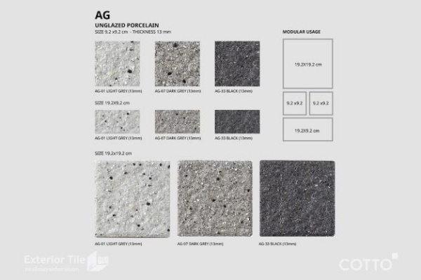 สีดำเหมาะกับพื้นที่ที่มีการสัญจรไปมาของผู้คนรอบ ๆ ตัวอาคารช่วยซ่อนคราบสกปรกได้ กระเบื้องตกแต่งภายนอก AG-33 Black ยังช่วยเพิ่มความโดดเด่นให้ตัวอาคาร เพื่อความโดดเด่นไม่ซ้ำแบบเดิม ๆ ในการปูกระเบื้องตกแต่งภายนอก มีให้เลือกถึง 3 ขนาด 9.2 x 9.2 cm, 19.2 x 9.2 cm. และ 19.2 x 19.2 cm. สามารถที่จะดีไซน์การปูโดยเล่นแพทเทิร์นในรูปแบบต่าง ๆ ให้สวยสะดุดตาแบบไม่ซ้ำใคร