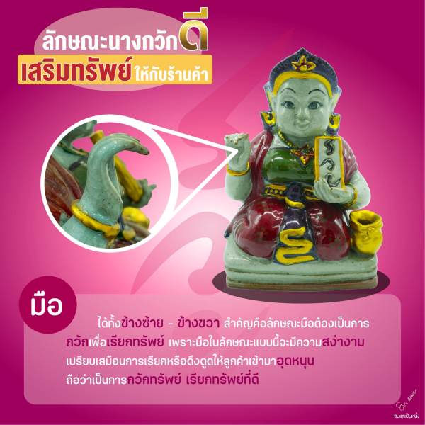 ได้ทั้งซ้าย – ขวา สำคัญคือลักษณะมือต้องเป็นการกวักเพื่อเรียกทรัพย์ เพราะมือในลักษณะแบบนี้จะมีความสง่างาม เปรียบเสมือนการเรียกหรือดึงดูดให้ลูกค้าเข้ามาอุดหนุน ถือว่าเป็นการกวักทรัพย์ เรียกทรัพย์ที่ดี