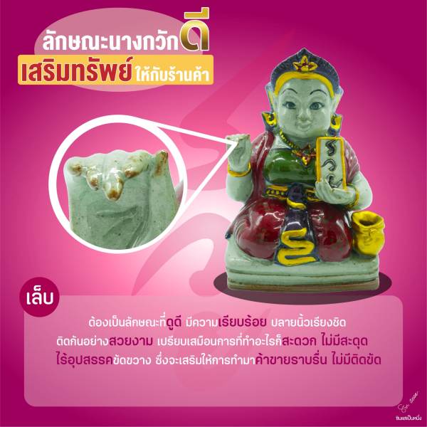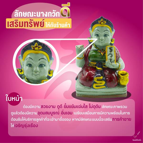 ต้องมีความสวยงาม ดูดี ยิ้มแย้มแจ่มใส ไม่ดุดัน ลักษณะภาพรวมดูแล้วต้องมีความอุดมสมบูรณ์ อิ่มเอม เปรียบเสมือนการมีความพร้อมในการต้อนรับให้บริการลูกค้าที่จะเข้ามาซื้อของ หากมีลักษณะแบบนี้จะเสริมการค้าขายให้เจริญรุ่งเรือง