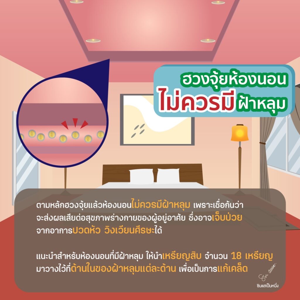 ตามหลักฮวงจุ้ยแล้วห้องนอนไม่ควรมีผ้าหลุม เพราะเชื่อกันว่าจะส่งผลเสียต่อสุขภาพร่างกายของผู้อยู่อาศัย ซึ่งอาจเจ็บป่วย