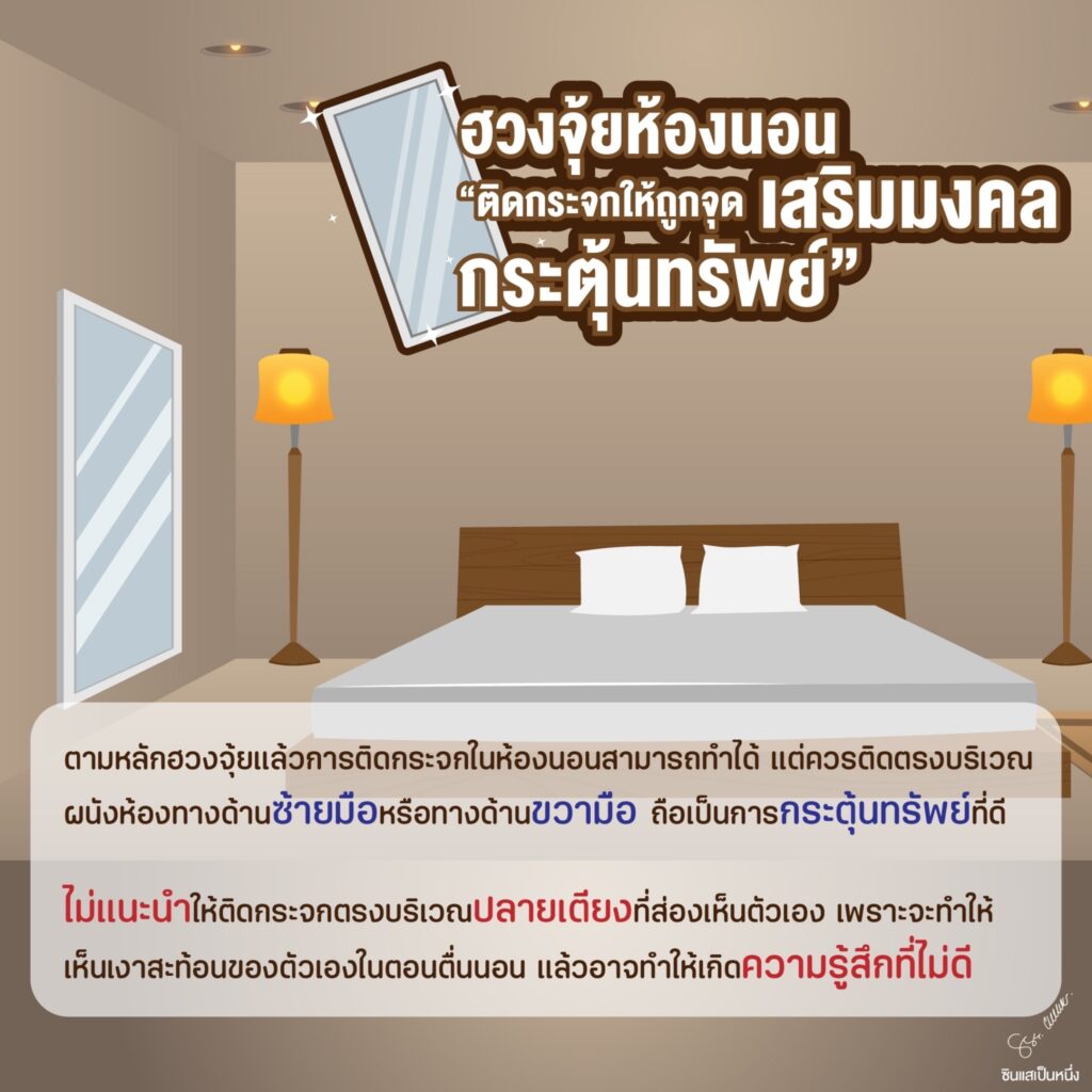 ตามหลักฮวงจุ้ยแล้วการติดกระจกในห้องนอนสามารถทำได้ แต่ควรติดตรงบริเวณผนังห้องทางด้านซ้ายมือหรือทางด้านขวามือ ถือเป็นการกระตุ้นทรัพย์ที่ดีไม่แนะนำให้ติดกระจกตรงบริเวณปลายเตียงที่ส่องเห็นตัวเอง เพราะจะทำให้เห็นเงาสะท้อนของตัวเองในตอนตื่นนอน แล้วอาจทำให้เคิดความรู้สึกที่ไม่ดี