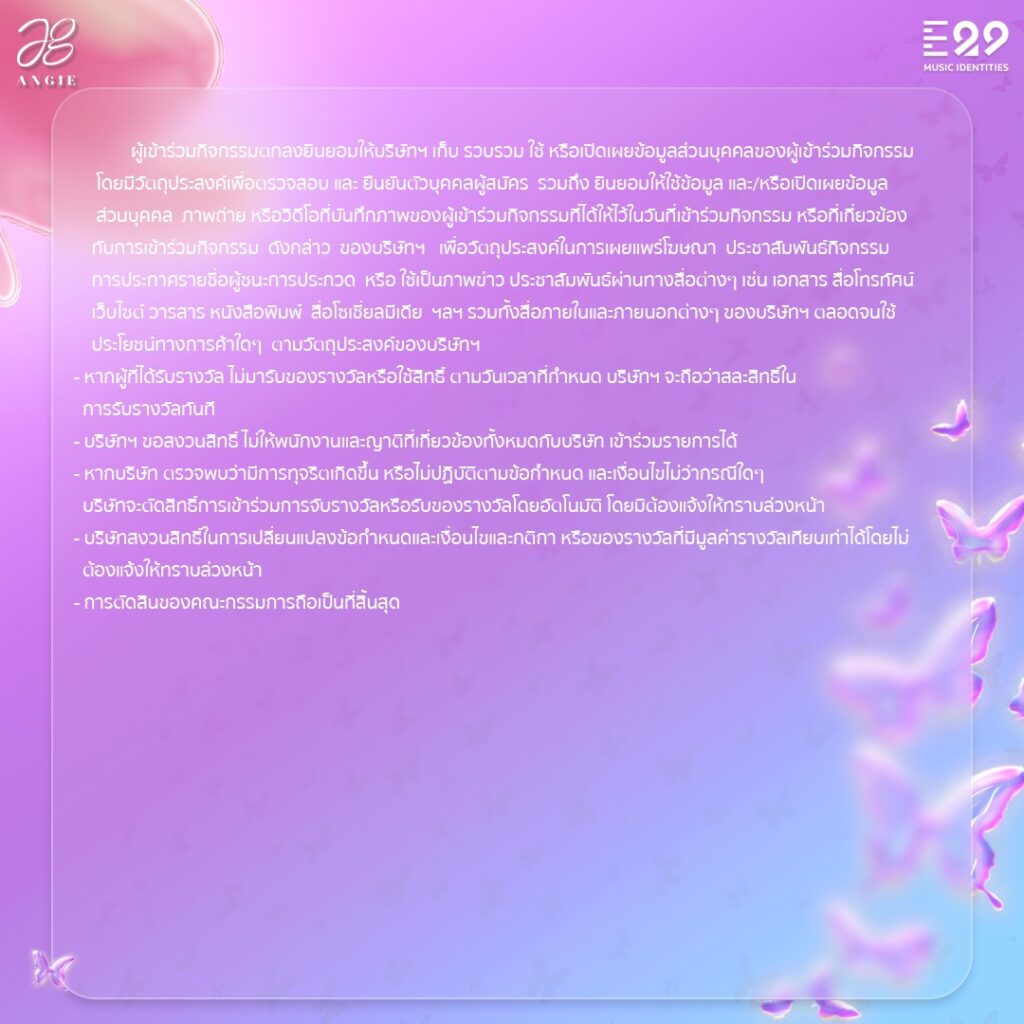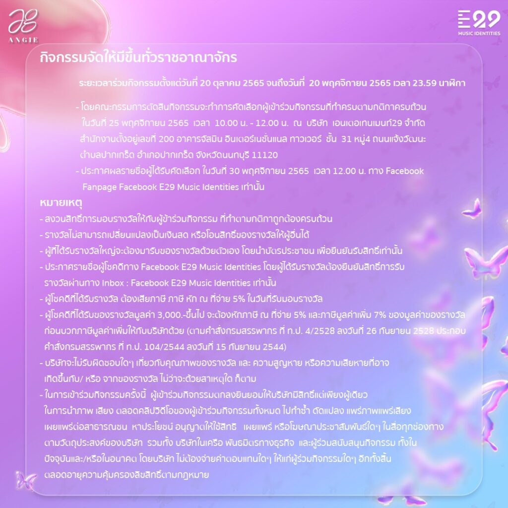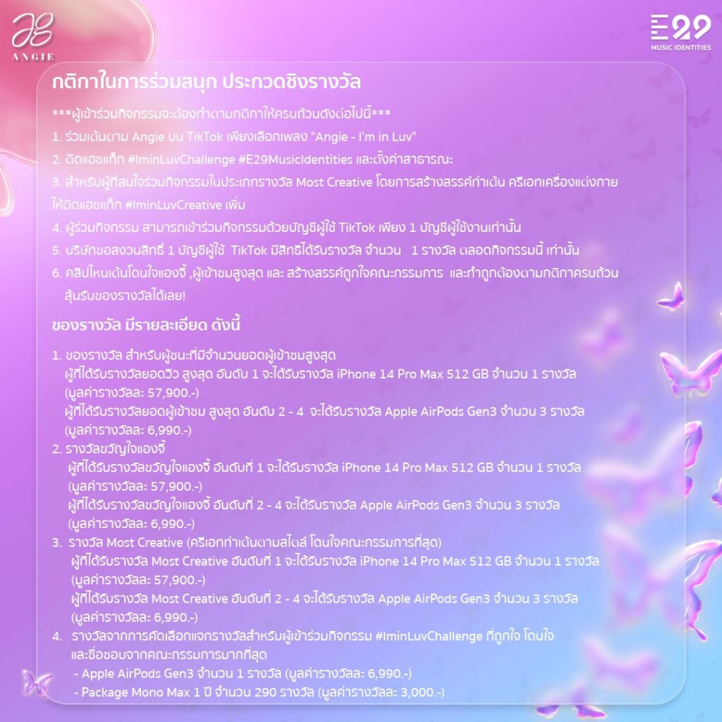 #IminLuvChallenge มาร่วม Challenge ท่าเต้นสุดคิวท์ พร้อมแชร์คลิปร้องเต้นเพลง “I’m in Luv” ในสไตล์ของตัวคุณเอง โพสต์ลงบน TikTok ร่วมลุ้นรางวัลใหญ่ อาทิ iPhone 14 Pro Max 512 GB 3 รางวัล, Apple Airpods Gen3 10 รางวัล และ Package Mono Max 1 ปี 290 รางวัล รวมมูลค่ากว่า 1 ล้านบาทโดยผู้ร่วมสนุกจะต้องทำถูกต้องตามกติกา ติด Hashtag #IminLuvChallenge #E29MusicIdentities และตั้งค่าเป็นสาธารณะ โดยรางวัลแบ่งออกเป็น 3 ประเภท ดังนี้ รางวัลยอดวิวสูงสุด, รางวัลขวัญใจแองจี้ และรางวัล Most Creative ซึ่งผู้ร่วมแข่งขันต้องติด Hashtag #IminLuvCreative ในรางวัลดังกล่าวด้วย นอกจากนี้ยังสุ่มผู้โชคดีที่ร่วมเล่นกิจกรรมลุ้นรับรางวัลแบบจุกๆ กันไปเลย แจก Airpods Gen3 1 รางวัล และ Package Mono Max 290 รางวัล ให้ชมฟรี 1 ปีเต็ม