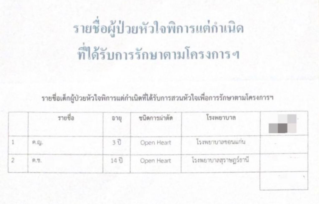 “โครงการ รักษาเด็กโรคหัวใจพิการแต่กำเนิดด้วยการผ่าตัดและการใช้สายสวนนอกเวลาราชการ” ตอนนี้เงินจำนวนดังกล่าว ได้ช่วยให้ผู้ป่วยที่ได้รับการ ผ่าตัดในโรงพยาบาลที่ร่วมโครงการจำนวน 2 ราย