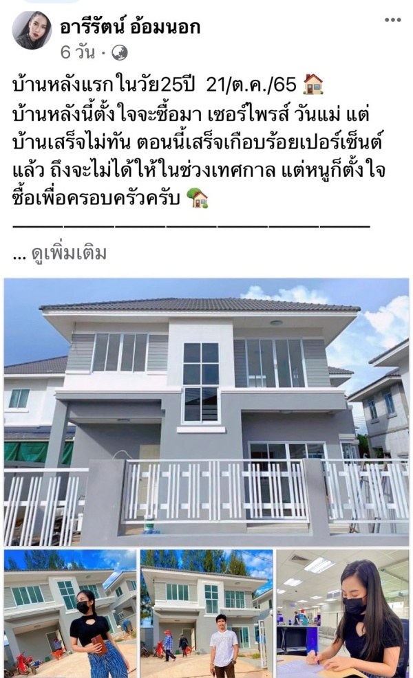 ออยเล่าว่า“ ดีใจมากค่ะ ที่ซื้อบ้านหลังแรกได้ในวัย 25 ปี หนูตั้งใจจะซื้อมา เซอร์ไพรส์ในวันแม่ แต่บ้านเสร็จไม่ทัน ตอนนี้เสร็จเกือบร้อยเปอร์เซ็นต์แล้ว ถึงจะไม่ได้ให้ในช่วงเทศกาล แต่หนูก็ตั้งใจซื้อเพื่อครอบครัวค่ะ ก่อนอื่นหนูอยากขอบคุณทุกคนในค่าย ฮักเด้อฮักเลอร์ ไม่ว่าจะเป็นทีมงานหรือแฟนคลับแฟนเพลง “ออยเลอร์” ทุกคน ขอบคุณกำลังใจจากพ่อแม่พี่สาวและน้องสาว ที่คอยซัพพอร์ตทุกความรู้สึก ทุกก้าวเดินของหนู ขอบคุณเพื่อน ๆ และผู้ใหญ่รอบข้าง ทุกองค์ประกอบที่หล่อหลอมให้มีตัวละครที่ชื่อ “ออยเลอร์” เกิดขึ้นมา ไม่กี่ครั้งหรอกที่หนูจะได้รู้สึกภูมิใจในตัวเองบ้าง ครั้งนี้รู้สึกดีใจและภูมิใจสุดๆ ขออยู่กับความรู้สึกดี ๆ ไปนาน ๆ ขอบคุณพี่ชายคนเก่ง “มาวิน” ที่จับมือกันไว้ตลอดไม่ว่าจะอยู่ในช่วงเวลาไหน ๆ