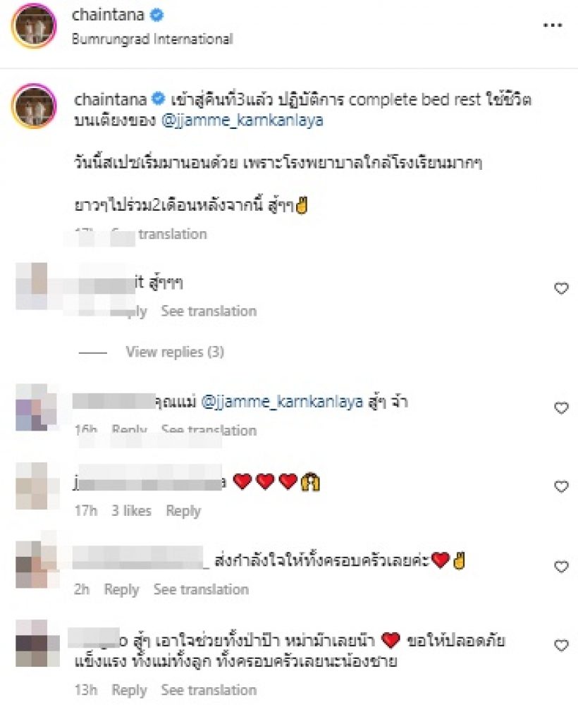 ซึ่งล่าสุด หนุ่มเชน โพสต์ภาพภรรยากำลังนอนบนเตียงคนไข้ที่ร.พ. พร้อมข้อความบอกว่า “เข้าสู่คืนที่3แล้ว ปฏิบัติการ complete bed rest ใช้ชีวิตบนเตียงของ @jjamme_karnkanlaya วันนี้สเปซเริ่มมานอนด้วย เพราะโรงพยาบาลใกล้โรงเรียนมาก ๆ ยาว ๆ ไปร่วม2เดือนหลังจากนี้ สู้ ๆ ๆ ✌️”