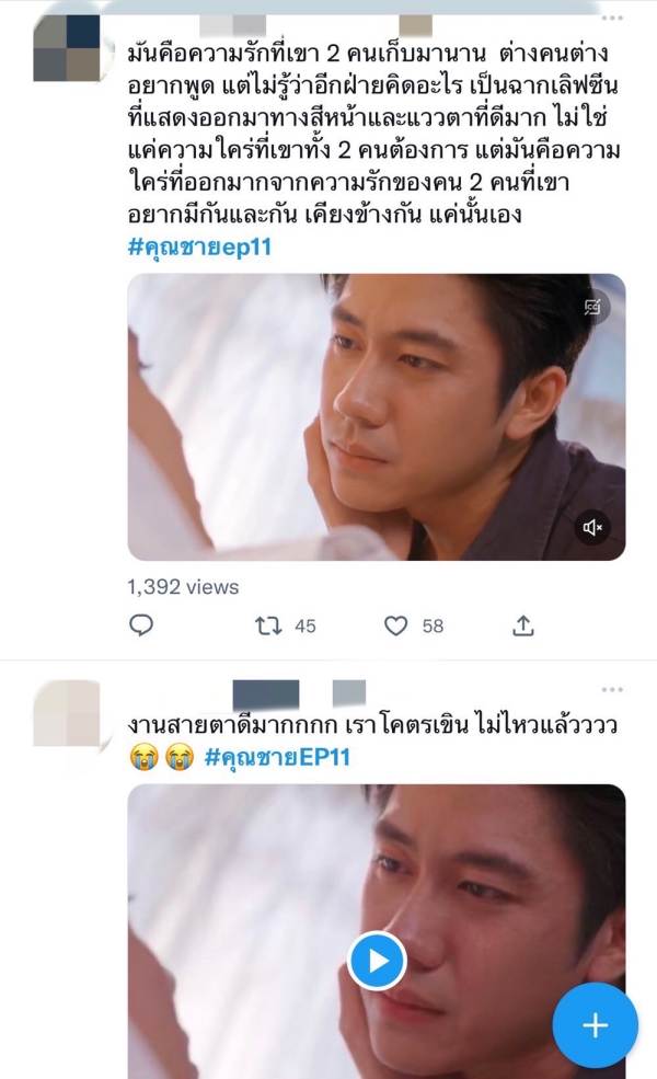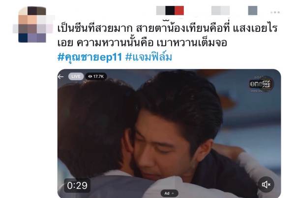เพราะการแสดงของ “ฟิล์ม-ธนภัทร กาวิละ” และ “แจม-รชตะ หัมพานนท์” ที่ถ่ายทอดฉากเลิฟซีนให้ออกมาดูสวยงาม อ่อนโยน โดยเฉพาะ งานสายตาที่ทั้งคู่เล่นได้ละเอียด นุ่มนวล ชวนฟินขั้นสุด จนพาเรตติ้ง พุ่งแตะ 2.24 (15+NW) , 2.63 (15+BKK) และ 2.27 (15+URBAN)