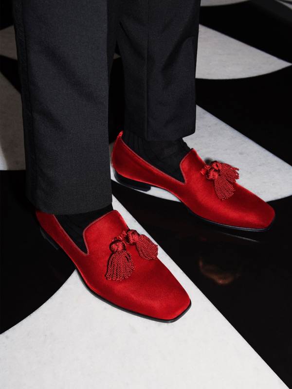 สำหรับคอลเลกชั่นบุรุษยังคงนำเสนอในคอนเซปต์กล่องของขวัญอัญมณีที่เน้นย้ำถึงความเย้ายวนใจในยามราตรี สู่ไอเทมรองเท้ารุ่น FOXLEY ทั้งแบบกำมะหยี่สีแดงทับทิม แต่งด้วยพู่ประดับด้วยไมโครคริสตัล สนีกเกอร์ DIAMOND LIGHT วาดลวดลายอัญมณีลงบนเหลี่ยมพื้นรองเท้าที่เป็นซิกเนเจอร์ เพิ่มความโดดเด่นด้วยแสงอัลตราไวโอเลตที่จะช่วยสร้างสีสันให้คุณผู้ชาย