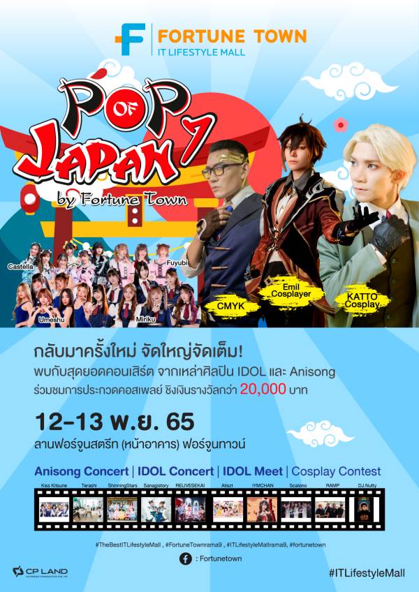 9 พฤศจิกายน 2565, กรุงเทพฯ – ฟอร์จูนทาวน์ (Fortune Town) ศูนย์รวมไอทีและไลฟ์สไตล์ชั้นนำย่าน รัชดา-พระราม 9 จัดกิจกรรมเอาใจเหล่าโอตะและคอสเพลย์ ส่งท้ายปี จัดเต็มความบันเทิงภายในงานที่เพิ่มดีกรีความมันส์อย่างต่อเนื่อง กับสุดยอดคอนเสิร์ตยิ่งใหญ่ที่สุดแห่งปี จากเหล่าศิลปิน IDOL และ Anisong (Anime + Song) พร้อมกับกิจกรรม Meet & Greet ที่พลาดไม่ได้ ในงาน POP OF JAPAN BY FORTUNE TOWN ครั้งที่ 7 วันที่ 12-13 พฤศจิกายน 2565 ลานฟอร์จูนสตรีท ฟอร์จูนทาวน์ รัชดา-พระราม9