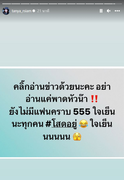 ล่าสุด สาวธัญญ่า ได้โพสต์ชี้แจงในไอจีส่วนตัวว่า “ตอนนี้เราอยากขอบคุณตัวเองมากที่สุด รู้สึกว่าตัวเองเข้มแข็งมากๆเลย รู้สึกมองเห็นคุณค่าในตัวเองเยอะขึ้นมาก ๆ ชอบความสุขในตอนนี้ที่สุด เป็นความสุขให้ตัวเองสร้างความสุขให้ตัวเอง อยู่กับตัวเองเยอะขึ้น ดูแลตัวเองเยอะขึ้น และรักตัวเองมาก ๆ เธอเก่งที่สุดนะ #ธัญญ่าอาร์สยาม” แต่อย่างไรก็ตัดสินไม่ได้ต้องลุ้น อิอิ แต่ล่าสุดเจ้าตัวก็ยังยืนยันว่า โสดอยู่!!