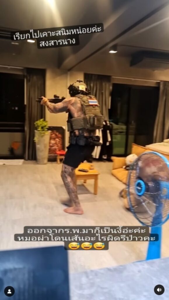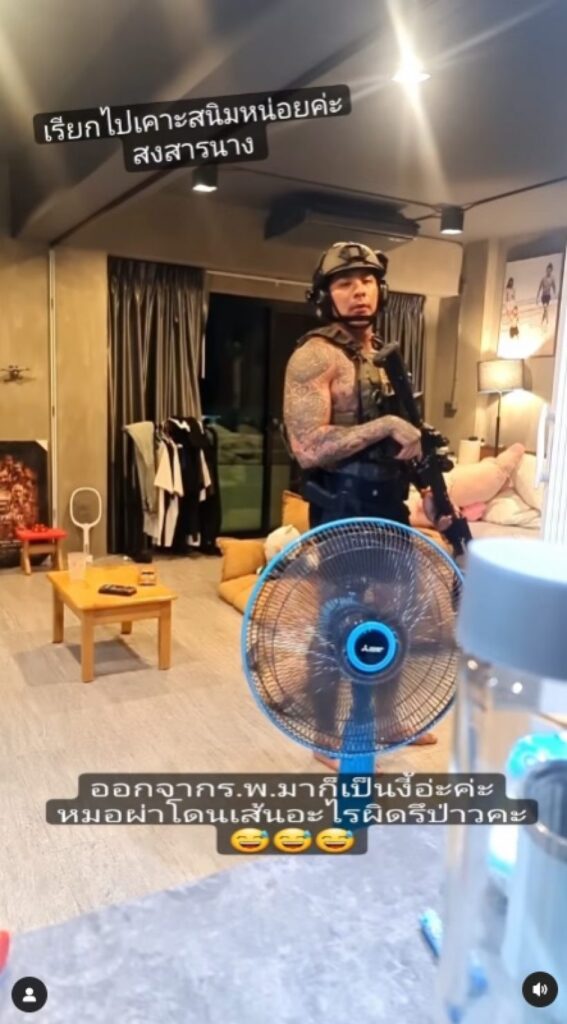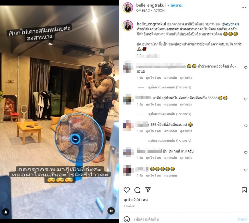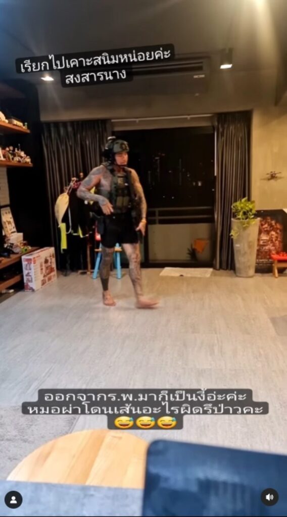 ล่าสุด หนุ่มแทค ออกจากโรงพยาบาลกลับมาใช้ชีวิตปกติได้แล้ว โดย“เบลล์ อดิราภ์”ภรรยาสุดสวย โพสต์คลิปสามีลงอินสตราแกรม ให้ชาวโซเชียลเห็นว่าสามีใส่ชุดเกราะ หมวดทหาร ถือปืน และทำท่าเหมือนกำลังออกรบ พร้อมแคปชั่นว่า “ออกจากรพ.มาก็เป็นงี้เลย รบกวนอจ. @ezychass เรียกไปเคาะสนิมหน่อยนะคะ น่าสงสารนางค่ะ ไม่มีคนเล่นด้วย สงสัยกีฬาอื่นจะไม่เหมาะ หันกลับไปแข่งยิงปืนวิ่งเหยาะๆจะดีสุด ปล.อุปกรณ์ทุกสิ่งเป็นของปลอมสำหรับการซ้อมเพื่อความสบายใจ นะจ๊ะ”