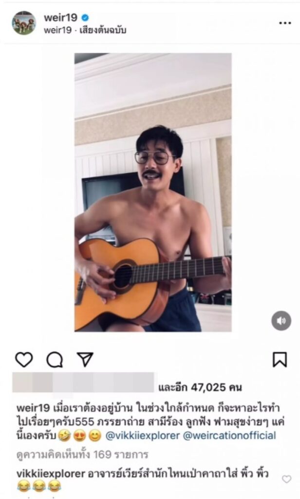 ล่าสุด คุณพ่อเวียร์ จัดเต็มด้วยการโชว์พลังเสียงในเพลง นะหน้าทอง พร้อมกับโชว์การเล่นกีตาร์ โดยมีแคปชั่นว่า “เมื่อเราต้องอยู่บ้าน ในช่วงใกล้กำหนด ก็จะหาอะไรทำไปเรื่อย ๆ ครับ555 ภรรยาถ่าย สามีร้อง ลูกฟัง ฟามสุขง่าย ๆ แค่นี้เองครับ @vikkiiexplorer @weircationofficial”
