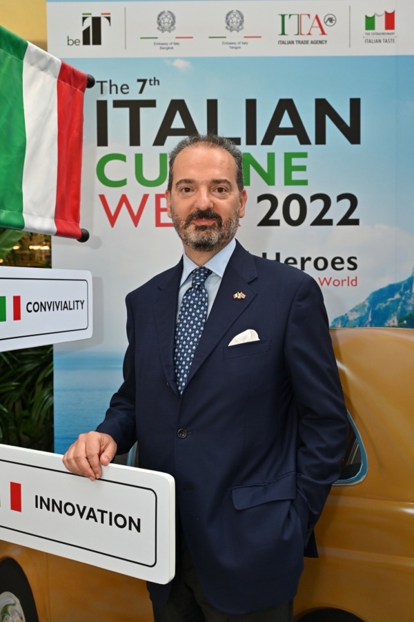 ฯพณฯ เปาโล ดีโอนีซี เอกอัครราชทูตอิตาลีประจำประเทศไทย กล่าวว่า “งาน The 7th Italian Cuisine Week ปีนี้จัดขึ้นภายใต้ 3 คอนเซ็ปต์หลัก Conviviality, Sustainability, and innovation ความมีชีวิตชีวา ความยั่งยืน และนวัตกรรม ด้วยวัตถุดิบของอาหารอิตาเลียนเพื่อสุขภาพที่ดีของทุกคนและการดูแลโลก ซึ่งนับว่าเป็นประเด็นสำคัญต่อสถานการณ์โลกในปัจจุบัน การเปลี่ยนแปลงของสภาพอากาศอาจส่งผลต่อสุขภาพ ความสามารถในการปลูกอาหาร ที่อยู่อาศัย ความปลอดภัย และการทำงาน ระบบการจัดการที่ยั่งยืนจะสามารถมอบประโยชน์ทางเศรษฐกิจไปพร้อมกับการพัฒนาชีวิต และปกป้องสิ่งแวดล้อม งานนี้ยังจัดขึ้นเพื่อแสดงให้เห็นถึงวัตถุดิบชั้นเลิศ ที่เต็มเปี่ยมไปด้วยคุณภาพสูงของอาหารและไวน์จากอิตาลี ความคิดริเริ่มในการส่งเสริมการขายนี้มีจุดมุ่งหมายเพื่อแสดงอาหารอันโอชะคุณภาพสูงของภาคส่วนไวน์และอาหารอิตาลี และทำให้วัฒนธรรมของเราเป็นสากลในขณะที่ส่งเสริมความยั่งยืน นอกจากนี้ เราได้เผยแพร่วีดิโอเกี่ยวกับ ‘Food Heroes’ โดย Slow Food เพื่อนำเสนอเทคนิคการผลิตอาหารที่เป็นแบบอย่างของอิตาลี เพื่อส่งเสริมและเฉลิมฉลองความคิดริเริ่มในแวดวงอาหารระดับโลก ที่ตอบสนองต่อสถานการณ์โควิด-19 ด้วยแนวคิดที่อาจสร้างแรงบันดาลใจให้แก่ทุกคนได้ โดยจากข้อมูลของหอการค้าไทย-อิตาเลียน ปัจจุบันประเทศไทยมีร้านอาหารอิตาเลียนอยู่ประมาณ 1,000 แห่ง โดย 200 แห่งตั้งอยู่อยู่ในกรุงเทพฯ และมีการนำเข้าอาหารอิตาเลียนมายังประเทศไทยเพิ่มมากขึ้นถึง 78.44 ล้านยูโร ในปี 2564 ที่ผ่านมา”